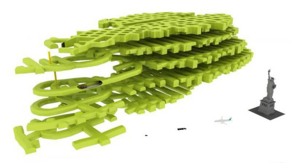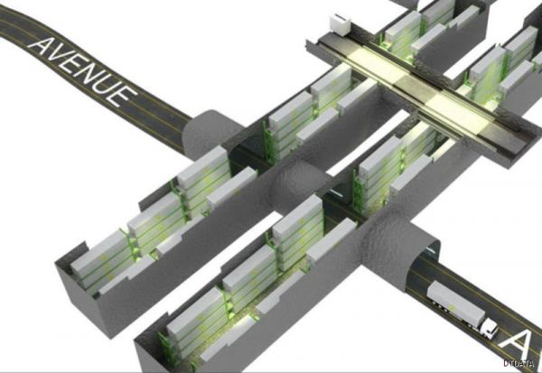 该矿山被挖掘成六层空间,有数个山间厅堂,顶部高度达到52英尺(约合16米)。它可通过地下的“通道”和“街道”进入。该数据中心潜在的最大占地面积为12万平方米,约合130平方英尺。对比上图右下角的自由神像、波音737飞机、拖车和汽车,就可以看出该设施究竟有多巨大。
