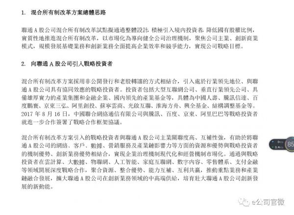 8月16日下午4点左右,网上关于混改方案的消息流传。事实上,当时中国联通港股针对专业投资机构举办了2017年度中期业绩会,除了披露中期业绩,混改方案的具体内容也有所透露。