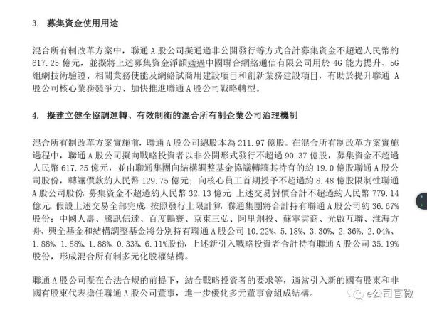 3.混改募集资金:联通A股公司拟向战略投资者以非公开发行形式发行不超过90.37亿股,募集资金不超过617.25亿元。并由联通集团向结构调整基金协议转让其持有的约19亿股联通A股股份,转让价约129.75亿元;向核心员工首期授予不超过约8.48亿股限制性联通A股公司股份,募集资金不超过约32.13亿元。上述交易对价合计不超过约779.14亿元。