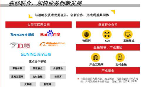 大数据等创新业务;战略投资者分布符合市场预期,但入股群体较为分散,总体四平八稳,个别互联网公司股权比例较低和其本身身份不匹配。